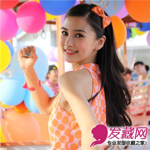 baby的发型主打青春少女系,飘逸的长发,自然的黑色,凸显好发质,同色系的橙色发夹点缀,甜美娇俏的气质立显。