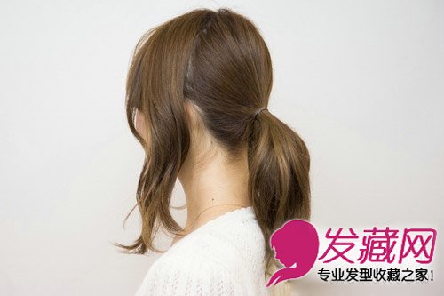 将头发分成前后两个区域,将后面的头发用橡皮筋绑成一个侧马尾。