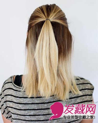 Step 1: 用你的梳子将头发梳至顺滑,然后抓起头顶处约1/3的头发,用橡皮筋绑成半披式绑好。