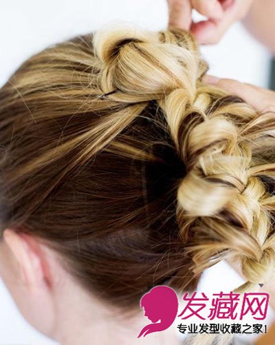 Step 7: 还记得开始时我们绑的3个辫子吗?虽然它们已经被编成1条的,但是绑着它们的3个橡皮筋还在哦!那么,我们翻一翻,找出最上面那个橡皮筋的所在位置,并用手将其抬高,用发夹将其加紧并固定住,这样是为了将那橡皮筋“隐藏”得更好。