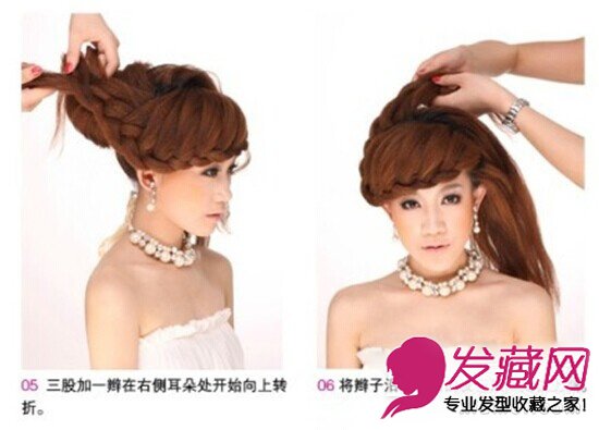 Step6:将辫子沿着后面的发包最高处往上编。