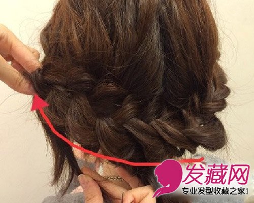 7.两大束辫子彼此交叉固定,发尾多次的部分用发夹藏起来。