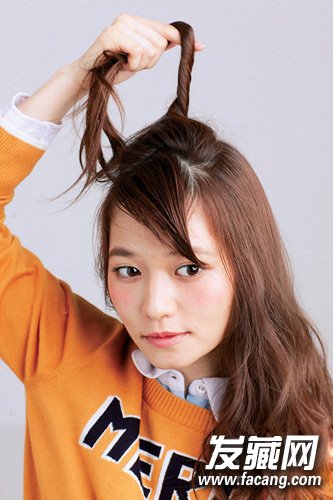 1,将头盖骨上方~头顶的头发前后分开,把后面的发束往后拧卷,中途用发卡固定。