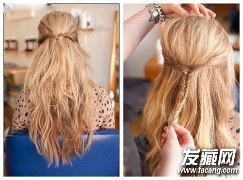 3.在两边耳侧各取一小撮头发,拧卷之后再中间扎在一起,然后往下编织麻花辫。