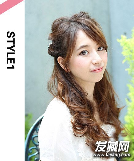 长卷发扎成公主头造型,卷发披散在肩头散发出浪漫气质,扭转的半扎发搭配刘海设计,妩媚多情。