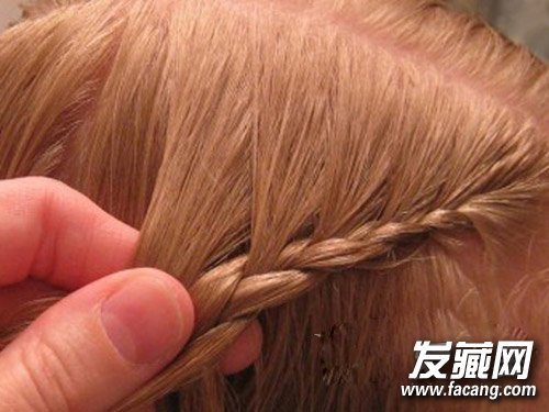步骤2、一侧先开始,分开三份,取第一份,从头顶部开始编一个四股的麻花辫。