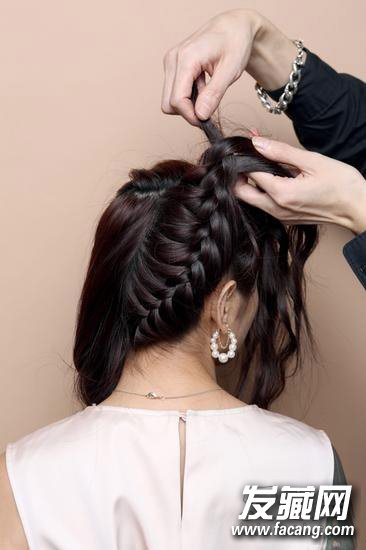 Step1:逆向打造,碎发都要归拢在发辫中后发打造的蝎子辫要从下向上逆向打造。