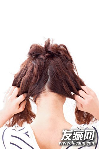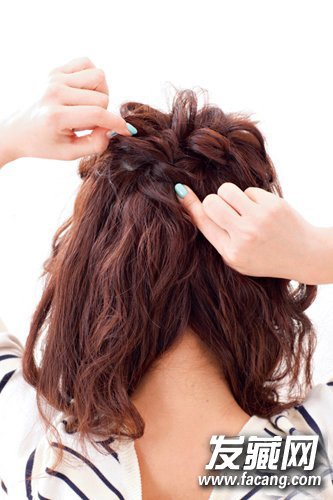 2,拉出少许发丝后打散。刘海也同样拧转后固定在太阳穴处。