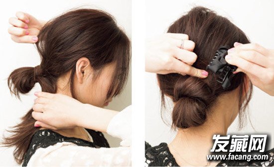STEP 4 将散着的发束围着橡皮圈位置缠绕。然后用夹子固定发尾。