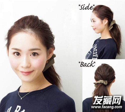 这款露额的长发扎发百搭各种脸型。将刘海拱起固定后再梳理头发,头顶位置蓬松的头发能拉长脸型。马尾可以适当偏左或偏右一点,这样可以从正面看到丝带装饰的夹子和漂亮的马尾。