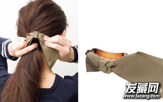 STEP 3 用一个固定夹将头发牢牢束好,可以适当偏左或偏右一点,这样可以从正面看到丝带装饰的夹子和马尾。