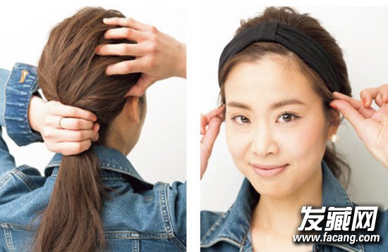 STEP 2 松动面部周围的头发后戴头巾,然后拉头发调整发际线的平衡。将面部周围的头发调整到可以遮脸的长度。还可以喷涂蓬松喷雾,并保持蓬松精致细微纹理。