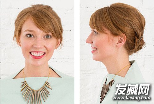 斜刘海既修颜又添加温婉气质,其余头发全部盘起来,非常清爽,而蓬松的头顶头发修饰MM头型。