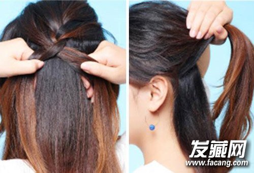 step2:下层的头发先编三股辫,固定好之后改编鱼骨辫。要注意三股辫进行到耳后时,先用橡皮筋绑起来,再以发夹固定。