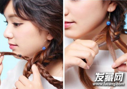 step4:结尾时将两个发尾的橡皮筋绑在一起即可;最后记得将发辫拉松,使得线条自然。
