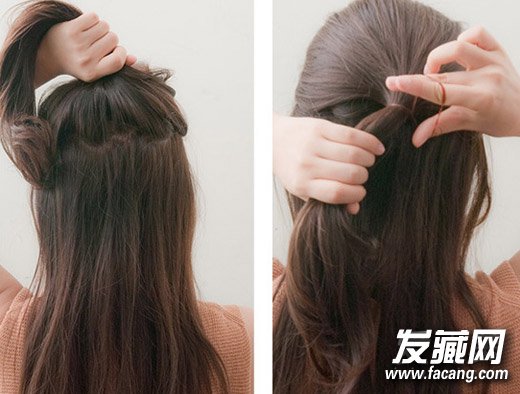 step2:将上方的头发用橡皮筋扎起来,半扎成一个公主头。