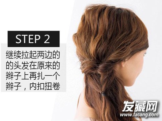 step2:将两边耳后的头发拉到扎好的辫子上面,再扎一个比较紧实的辫子,继续向上内扣扭卷。并将其他的头发拨到扎辫子那边的肩膀上。