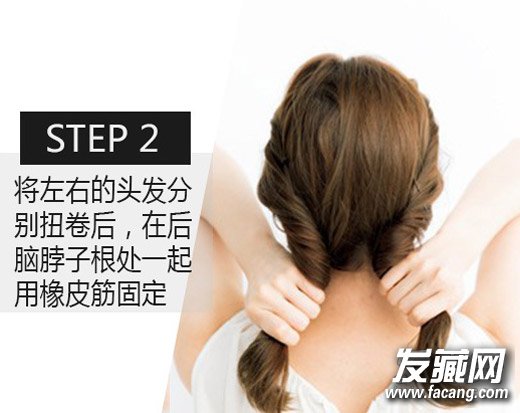 step2:把后面的头发分成两个部分,从耳前的头发开始扭卷,慢慢加入其他头发,如图,将所有的头发扭卷成两束至脑后。最后将两束头发合在一起,用橡皮筋固定即可。