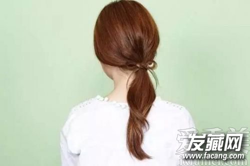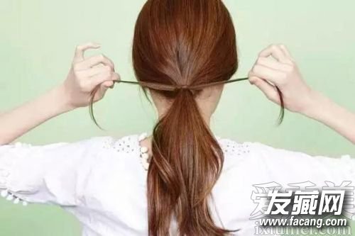 第二步:从马尾下方抽出一小部分头发分成两部分,绕着皮筋在上方打一个结。