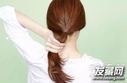 第一步:简单扎一个低马尾,用手轻轻地把头顶的头发拉松。