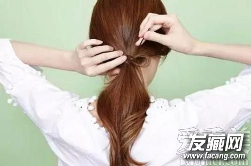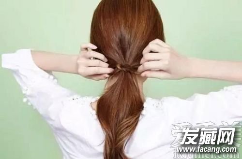 第三步:就像礼物包装的蝴蝶结一样,用头发系一个蝴蝶结,不需要太用力,只要弄出蝴蝶结的样子就好。