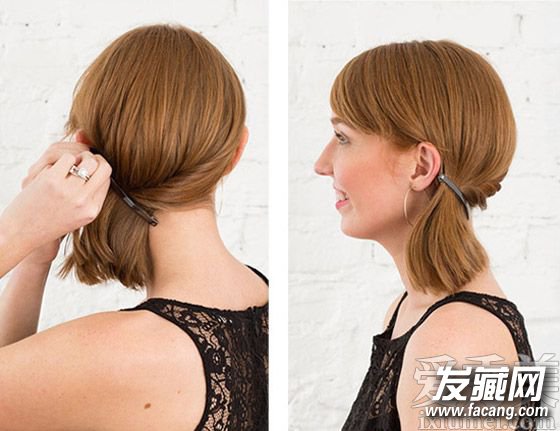 step2:把前方的头发别到耳后,有其他的头发一起扭卷。
