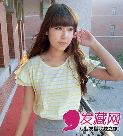 时尚可爱的长卷发,微微的烫发,俏皮清新,厚重的平刘海加入既显示少女的萌感,又能很好的修饰长脸型。