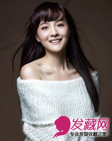 精致长脸型,首先剪个萌动的齐刘海遮住大额头,圆俏的脸型轮廓散发出纯洁淡雅的美感,乌黑的长发随风飘逸,气质清新,露肩毛衣不失妩媚时尚气息