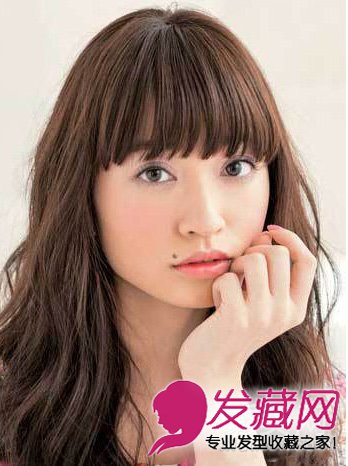 小编点评:长及眉眼的长刘海遮盖住近三分之一的脸颊,长脸瞬间变身小V脸。栗色长卷发沿着脸颊摆动,勾勒出女神般的慵懒唯美感。