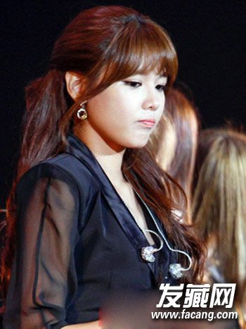 软妹纸们最心水的一款超甜的韩式发型扎法,棕色染发的长卷发扎简单的发辫造型,搭配内扣的齐刘海修颜,可爱俏皮。