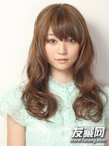 不规则的大波浪卷发,是长脸女生的首选,不规则的视觉感修饰脸部的缺陷,棕色的挑染配上同样修颜的斜刘海,时尚感十足。