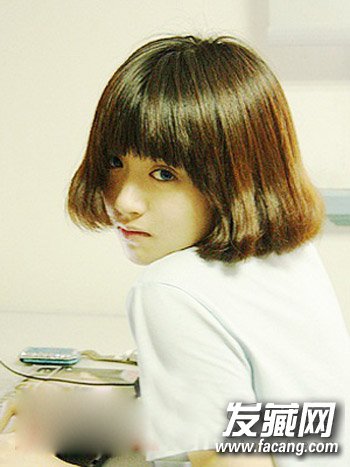 棕色的中短发,发尾做出卷度,增加时尚蓬松气息,减龄齐刘海设计尽显小女生的纯真可爱气息,这款简单甜美的发型很适合校园女孩。