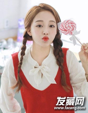 一款很适合校园女生的时尚长脸发型设计,以明亮的棕黄色染发颜色来衬托出女生肤色的白皙感,再搭配清爽的露额造型与双马尾辫的编发设计同样活力吸睛。