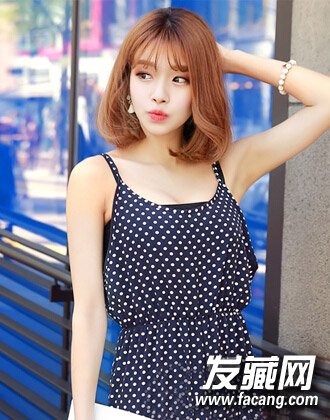 简单的内扣齐肩发发型,搭配上轻盈的刘海,轻松缩短了脸型的比例,达到了小脸的效果,凸显出甜美的气质来,棕色的染发也显得无比的时尚。