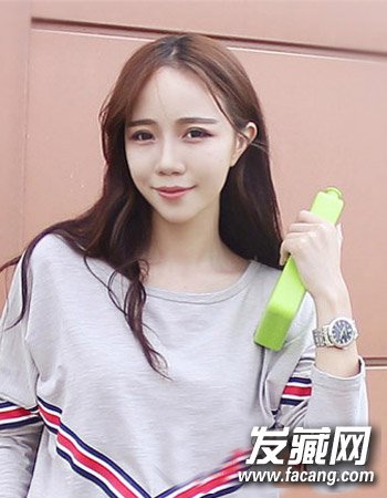 时尚的中分造型设计将女生饱满的额头完美的呈现出来,再搭配深棕色的染发颜色与清新飘逸的长发造型,与女生鹅蛋脸形式的长脸相搭更添温柔淑女风。
