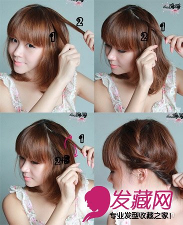 从一侧挑出一束头头,分成1和2,旋转1和2,在2的旁边挑出一束新的发束3,将2和3合成一束,将2+3和1旋转。以此类推,一直向下旋转编发。