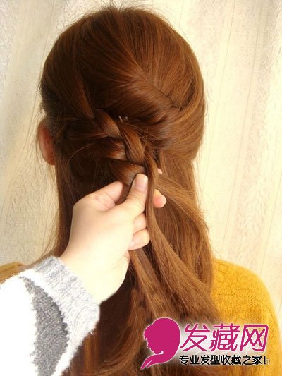 长发发型扎法步骤10:编至中间处,从右手边取出一股头发加入进去,继续编。