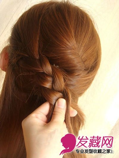 长发发型扎法步骤9:把左侧分出的头发抓起,从左至右分为三股发束编成一股麻花辫。
