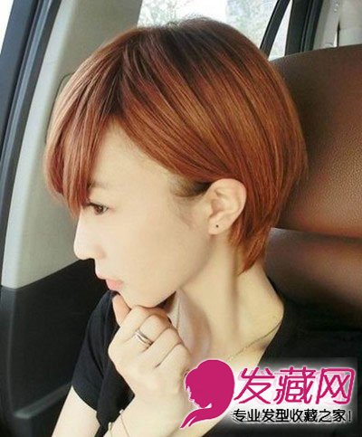 bobo头短发+棕红色染发,头发勾在耳后很显脸小,二八分的刘海,亮丽的染发颜色,显得皮肤更加白皙,气质女生范。