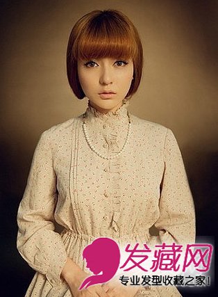 齐刘海的蘑菇头短发,一种欧式风格的感觉,绝对的复古款。金棕色的染发颜色,让整体有一种油画的感觉。