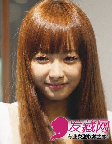 清新女生最爱的圆脸直发发型,会女生看起来知性甜美,轻薄的齐刘海设计,还很好的修饰出了一张精致的小脸脸型,棕色和栗色挑染的染发颜色,营造出轻熟女的气质范,非常的清纯好看。