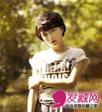 有点波波头的感觉,头顶的发丝很自然地盘到一侧,搭配简单的T恤,透着一点中性,却又带着一些小女人的气质。可爱性感两不误呢!