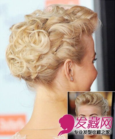 这种造型适合不及肩的头发,先往刘海喷洒喷雾,营造波浪感,再用电吹风造型。用烫发器把几段头发烫卷,再用夹子把头发随意地固定在头顶。