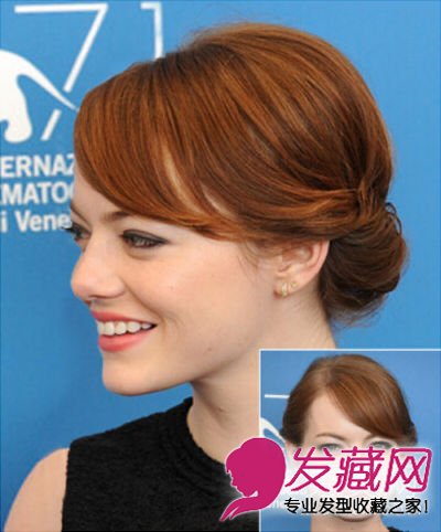艾玛在威尼斯电影节上以短波波头和侧发髻示人,也为短发造型带来新的灵感。她把发髻扎得很松,并把剩下的头发卷到脖子后面固定。往头发喷一些喷雾增加光泽。