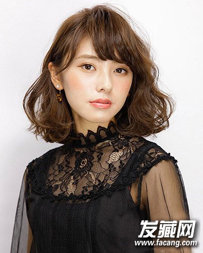及肩发型电卷后显得蓬松自然,斜刘海+两侧卷发能起到小脸的作用,遮掩脸部轮廓,巧克力发色也是相当时尚百搭。