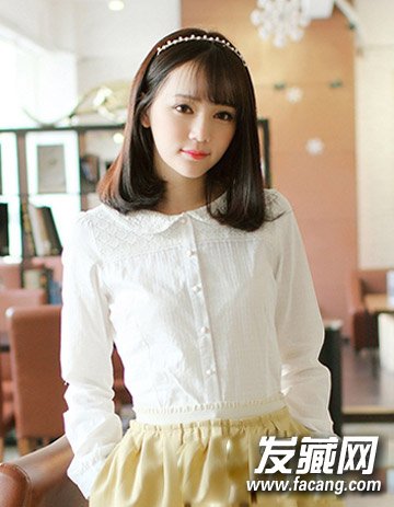 很显清纯甜美风的一款2015年时尚女生中短发发型,清新自然的乌黑发色本就很显女生的清纯甜美风,而配合简单的斜刘海与内扣式的发梢造型还有一个精致的发箍更显女生的可爱甜美风。