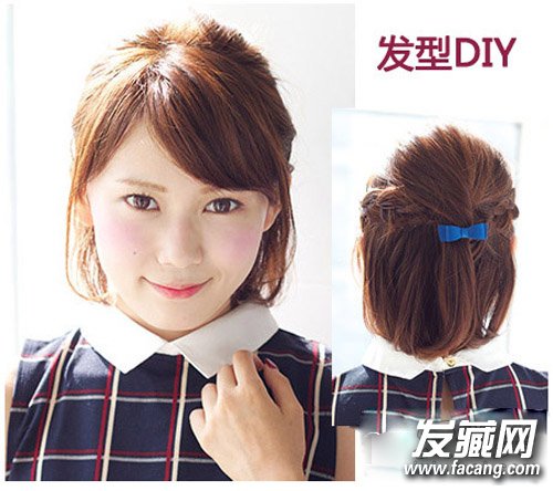 斜刘海与鬓角修饰脸型,而辫子与扭转发束让中短发显得更加别致,而蓝色小发卡让造型的吸睛指数更高。