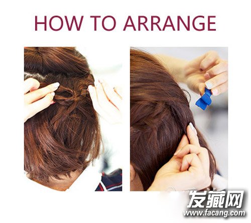 step 3:两侧的小辫子向后集中,稍微弯曲发尾用黑色发卡固定。