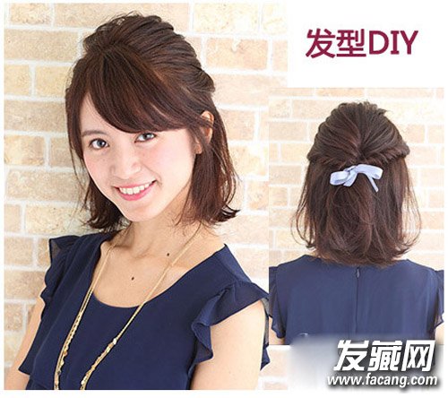 斜刘海同样修颜瘦脸,扭转发束半扎增添个性,浅蓝色发带清新动人,同样也有提升吸睛指数的功能。