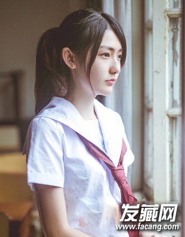 身着校服的女生一款清新的高马尾发型再适合不过了, 不仅甜美十分而且显露出无比的清纯气质来,造型简单大方。